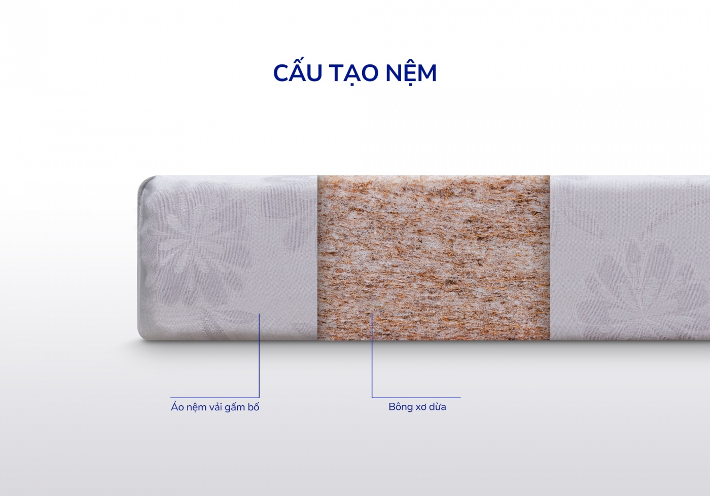 Chất liệu tự nhiên an toàn: Sử dụng 100% bông sợi xơ dừa thiên nhiên, đã qua xử lý khử trùng và diệt khuẩn, hạn chế sự xâm nhập của mối mọt và côn trùng, đảm bảo an toàn cho sức khỏe người dùng.